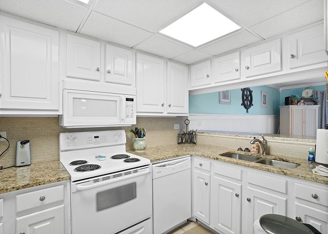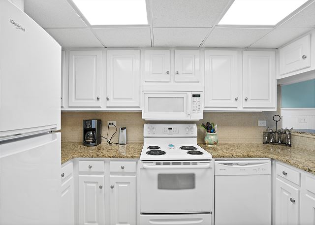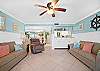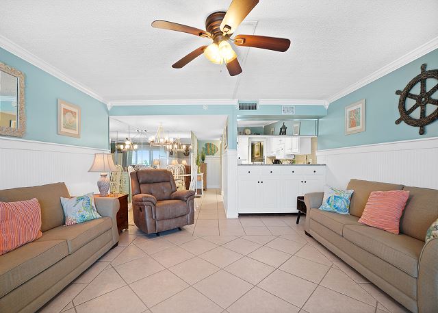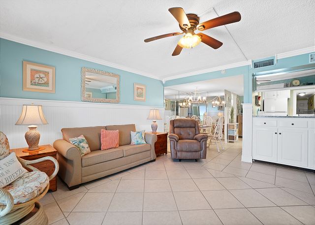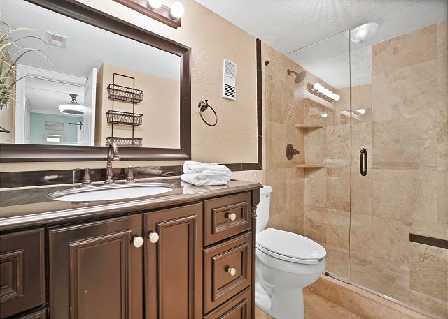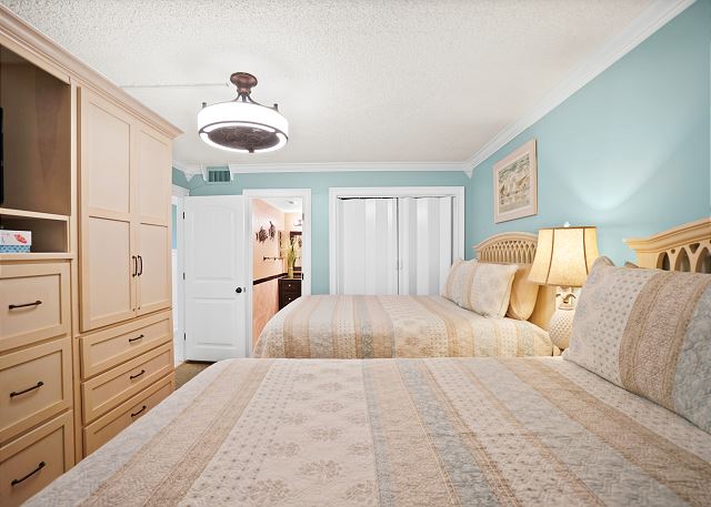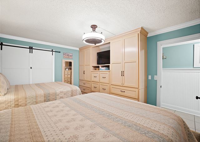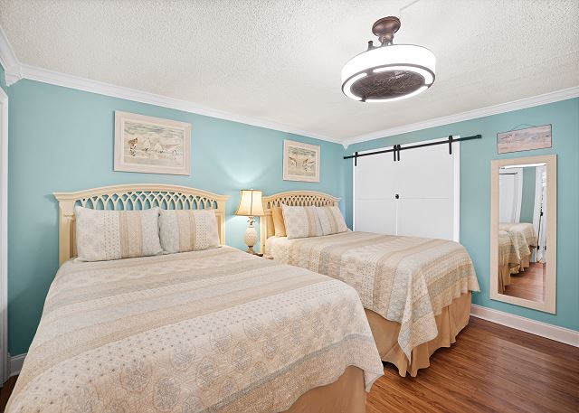 This unit has 2 Queen Beds, TV in both the bedroom and living room, ceiling fan and private master bath with a walk-in shower! Second full bath is adjacent to the kitchen and has a tub/shower combo.